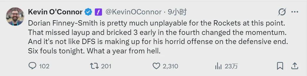 谁是火箭本赛季最失败的引援?毫无疑问,芬尼-史密斯!NBA名记Kevin O'Connor写道:“芬尼-史密斯在火箭的表现已经到了几乎无法上场的地步。他在防守端的作用,也不能弥补他糟糕至极的进攻表现,真是噩梦一般的赛季!”