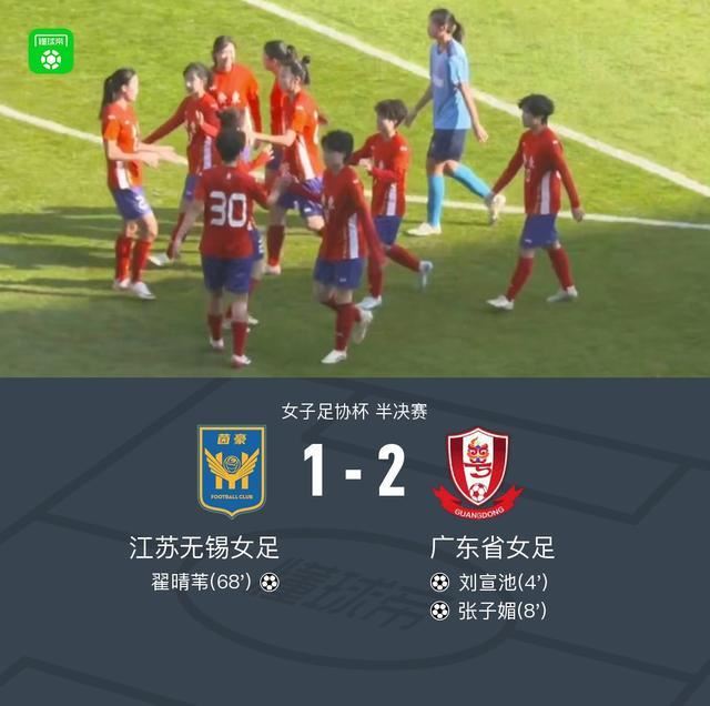 北京时间12月21日,女子足协杯半决赛展开较量,江苏无锡女足与广东省女足展开对决。上半场刘宣池开场头球破门,随后张子媚过人后在禁区内劲射破门扩大比分。下半场翟晴苇轰出一记世界波扳回一球。最终广东女足2-1战胜江苏无锡女足进决赛。