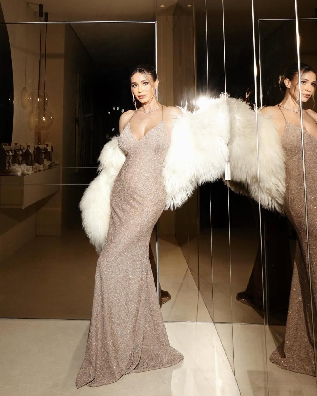 在最新曝光的写真中,32岁的莱奥塔为意大利品牌Atelier Eme拍摄宣传照。她站在圣诞树旁摆拍,金色礼服剪裁贴身,低胸设计突出造型细节。她将金色长发向后梳成低发髻,并搭配一条简约项链。