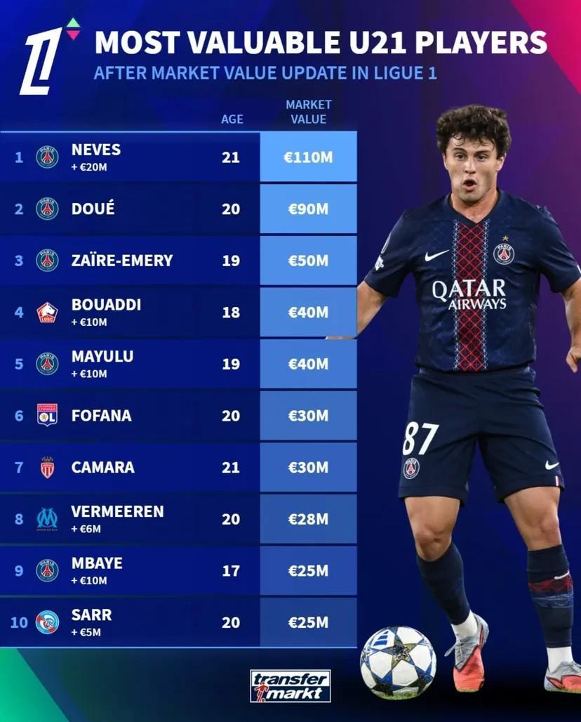 北京时间12月15日,在更新了法甲球员的身价之后,德转列出了法甲U21球员身价榜,此次更新后身价暴涨2000万欧元并升至1.1亿欧元的若昂-内维斯排名第一,杜埃9000万欧元第二,扎伊尔-埃梅里5000万欧元第三。