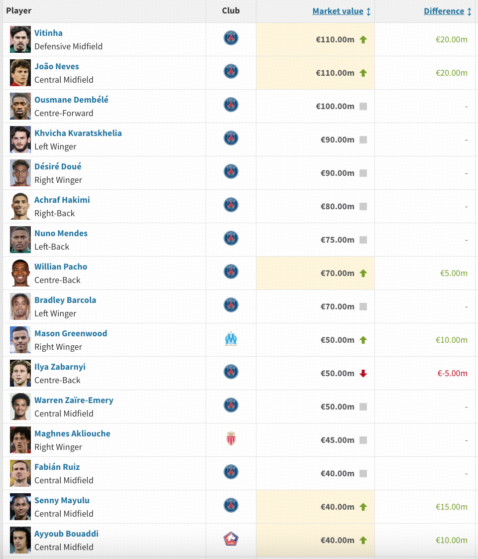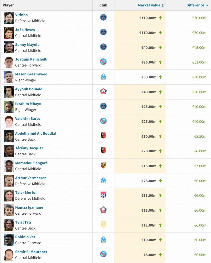德国转会市场更新最新一期法甲球员身价,巴黎圣日耳曼队的葡萄牙中场双子星维蒂尼亚与内维斯双双涨至1.1亿欧,马赛前锋格林伍德涨至5000万欧,成为前10名里唯一一位非PSG球员。