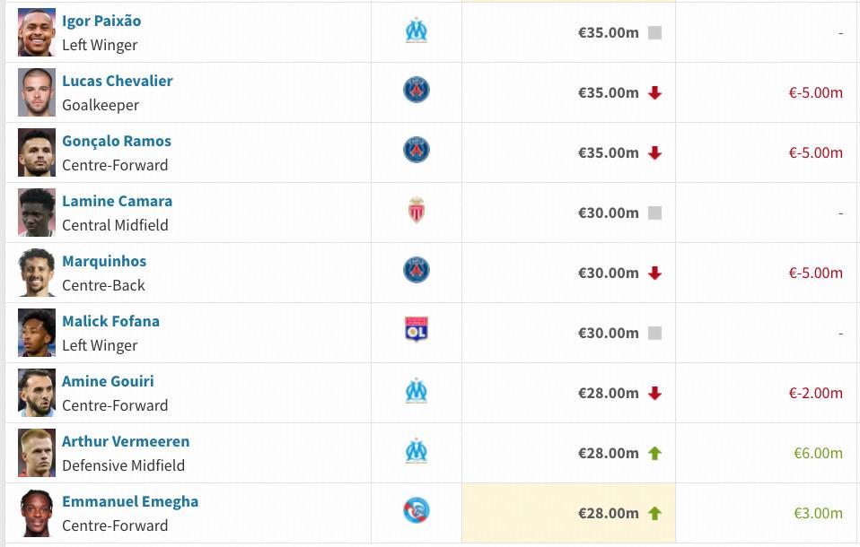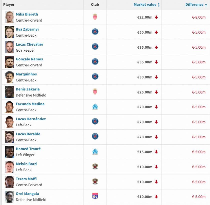 法甲身价跌幅榜