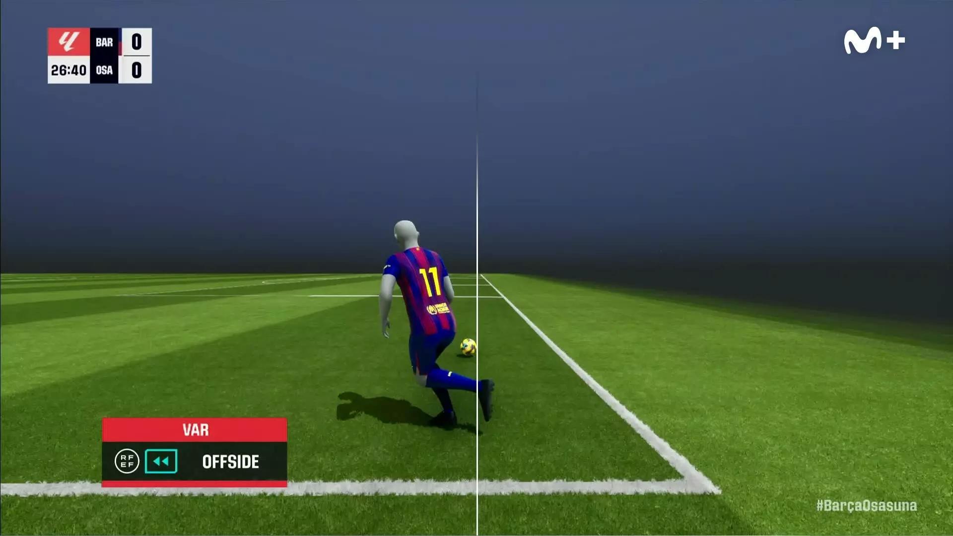 在巴塞罗那对阵奥萨苏纳比赛中,巴萨的首粒进球因越位被吹罚无效,该越位判罚由半自动越位系统(SAOT)精准检测得出。尽管画面中呈现的越位线看似未与球门线平行,但这一视觉偏差源于图像拍摄的视角问题。当三维场景被投射至二维平面图像上时,现实空间中向远方延伸的平行线,会在视觉上向地平线上的消失点汇聚。