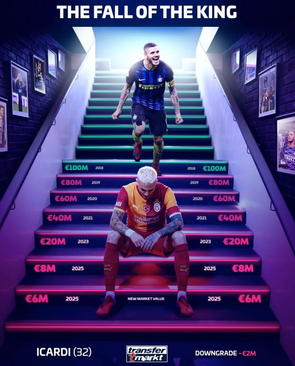 2018年在效力国米期间,伊卡尔迪的德转身价一度达到1亿欧元,但此后7年时间里,这位阿根廷球星的身价不断下跌,在德转2025年的最后一次身价更新之后,仅剩600万欧元。