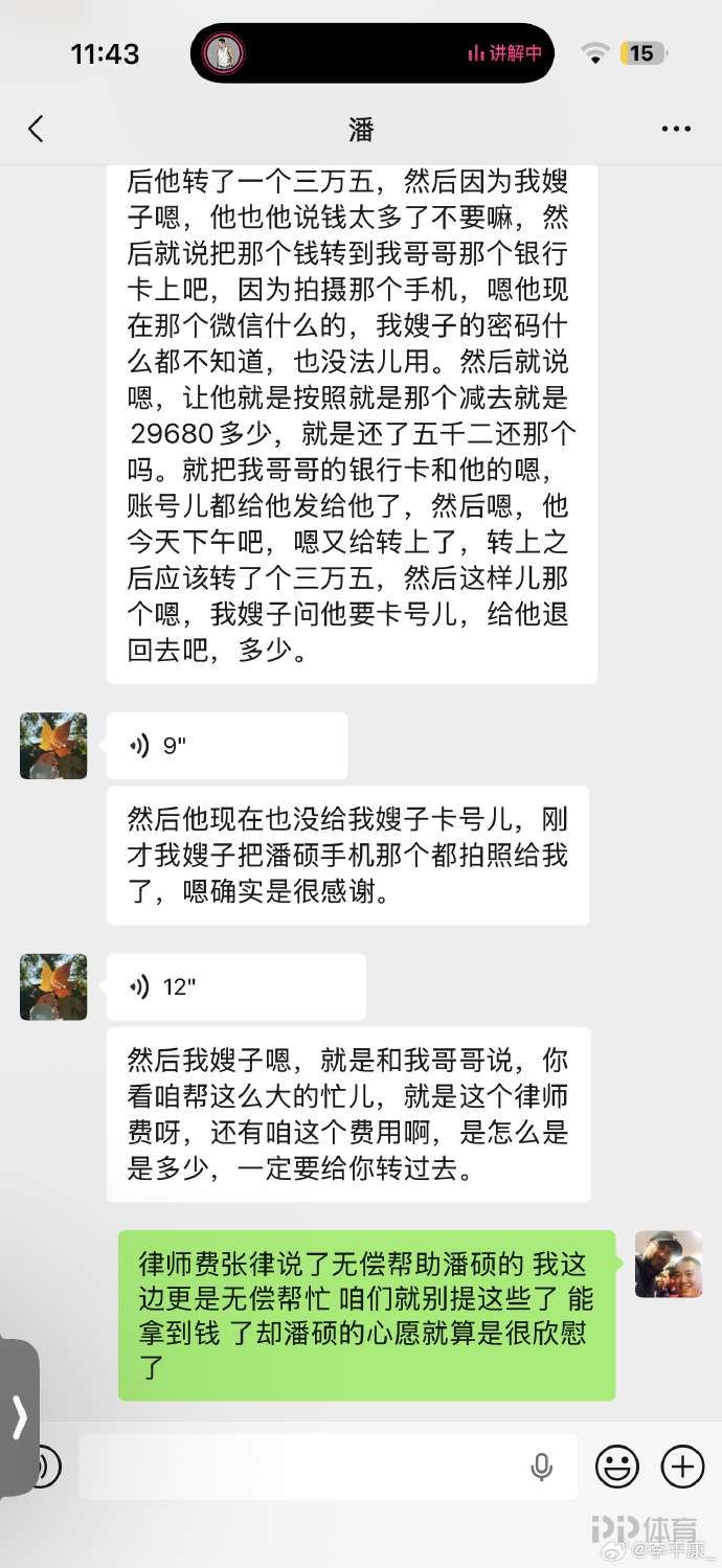 潘硕家人发来信息,戴琳已把欠款于今日还清,而且还有多给5000多,潘妈妈不愿多收,表示想要退回,不过戴琳也没有答应还是转了35000,这一点还是要客观的通报给大家的,相信潘硕在天之灵也会欣慰的… 潘硕家人也委托我在微博上向所有关心他们的球迷朋友表达感谢!这件事总算了结,也希望潘硕可以安息!
