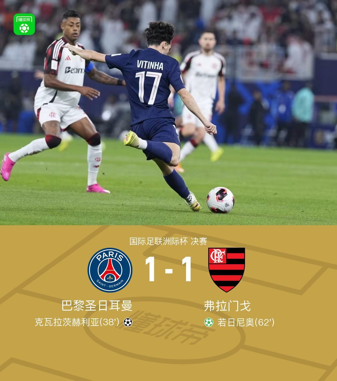 北京时间12月18日,国际足联洲际杯决赛在巴黎圣日耳曼与弗拉门戈之间展开。比赛中,克瓦拉茨赫利亚为巴黎圣日耳曼率先取得进球。随后,若日尼奥通过点球为弗拉门戈扳平比分。双方在常规时间内战成1-1平。