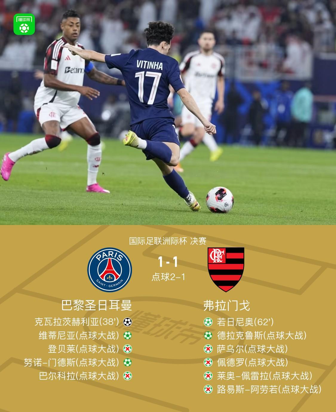点球大战巴黎2-1弗拉门戈,总比分3-2夺冠,萨福诺夫4次扑点