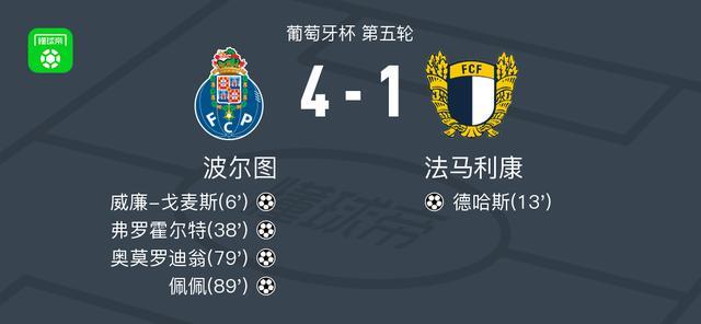 北京时间12月19日,葡萄牙杯第五轮展开较量,波尔图迎战法马利康。比赛开始后,波尔图率先取得进球,威廉-戈麦斯成功破门,为球队打开局面。随后,法马利康迅速做出回应,德哈斯攻入一球,将比分扳平。上半场临近结束前,波尔图再度发力,弗罗霍尔特破门得分,帮助球队重新掌握领先优势。进入下半场,波尔图持续施压,并在第79分钟由奥莫罗迪翁再下一城,进一步扩大比分。临近终场前,佩佩为波尔图攻入第四球,彻底锁定胜局。最终全场比赛结束,波尔图以4比1战胜法马利康,顺利晋级下一轮。