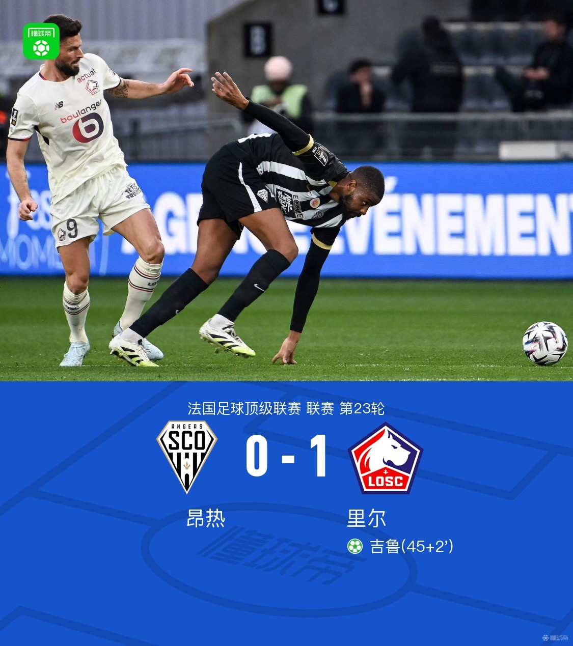 北京时间2月23日法国足球顶级联赛第23轮,昂热主场迎战里尔。上半场补时阶段,桑托斯造点,吉鲁点射打入制胜球,最终昂热0-1不敌里尔。