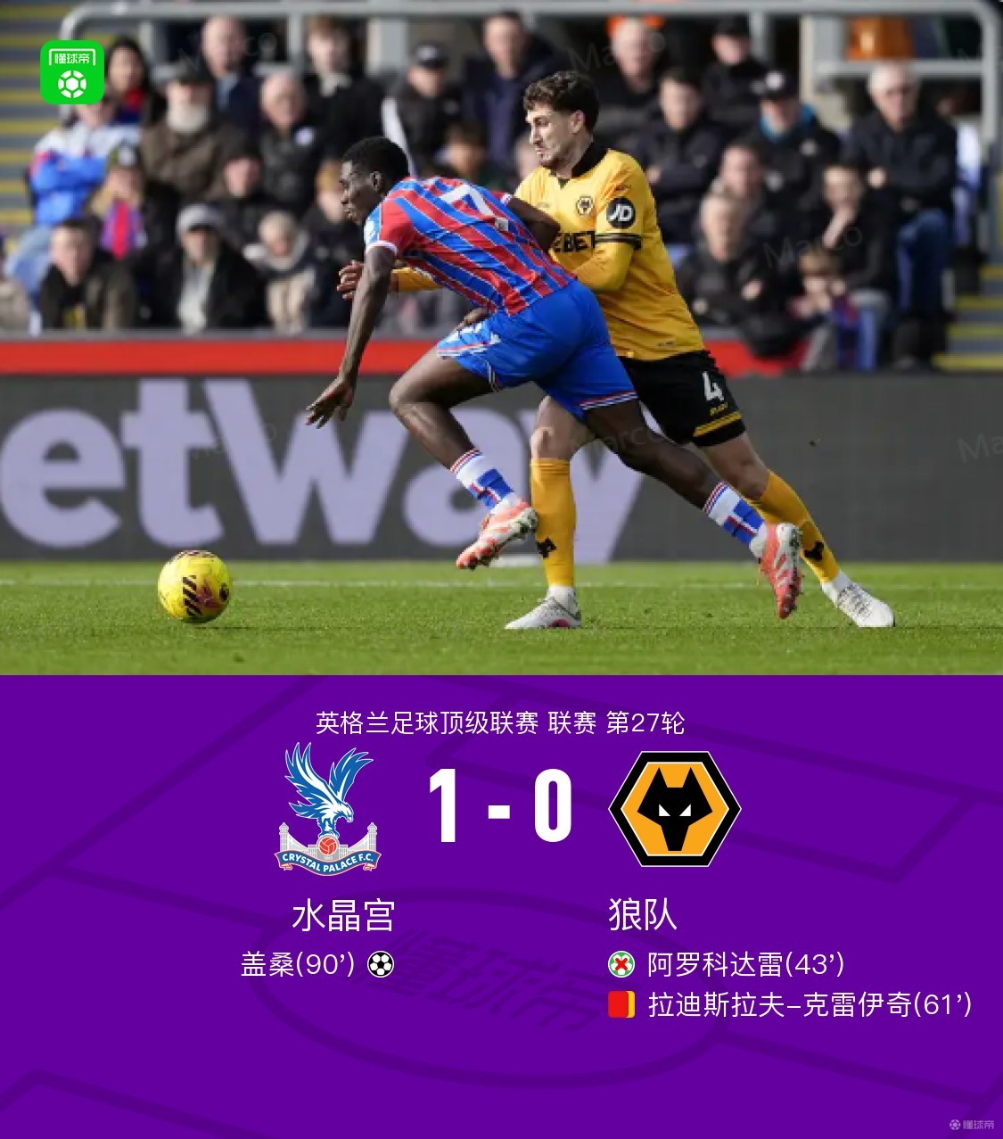 北京时间2月22日英格兰足球顶级联赛第27轮,水晶宫主场对阵狼队。狼队阿罗科达雷丢点,克雷伊奇染红,水晶宫盖桑破门。最终比分水晶宫 1-0 狼队。