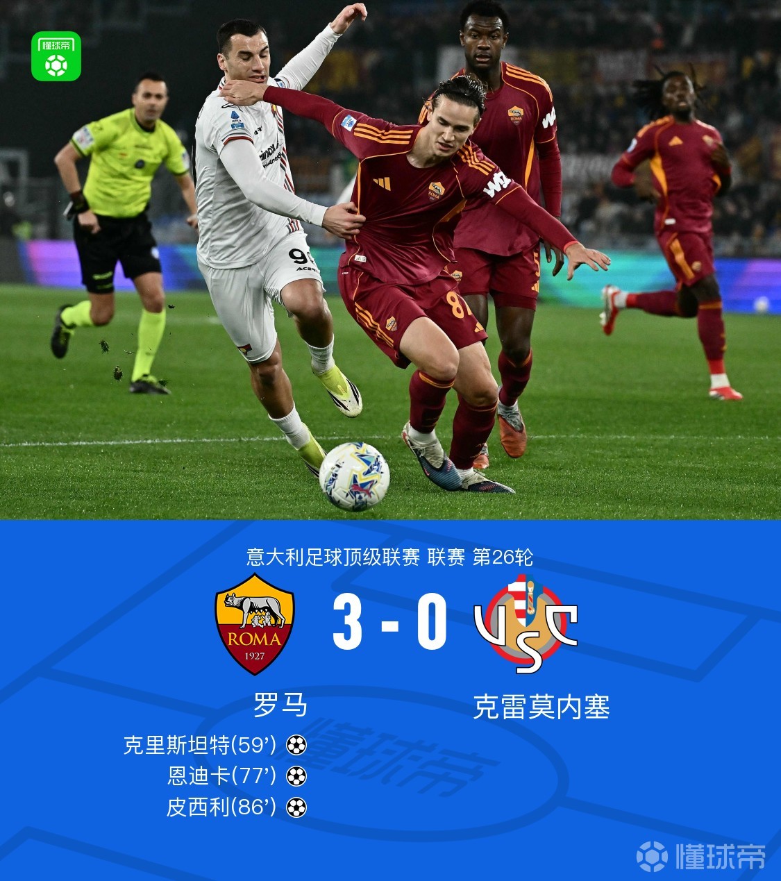 第86分钟,皮西利禁区补射破门,罗马3-0克雷莫内塞
