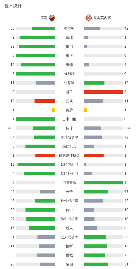 第59分钟,克里斯坦特禁区头球破门,罗马1-0克雷莫内塞