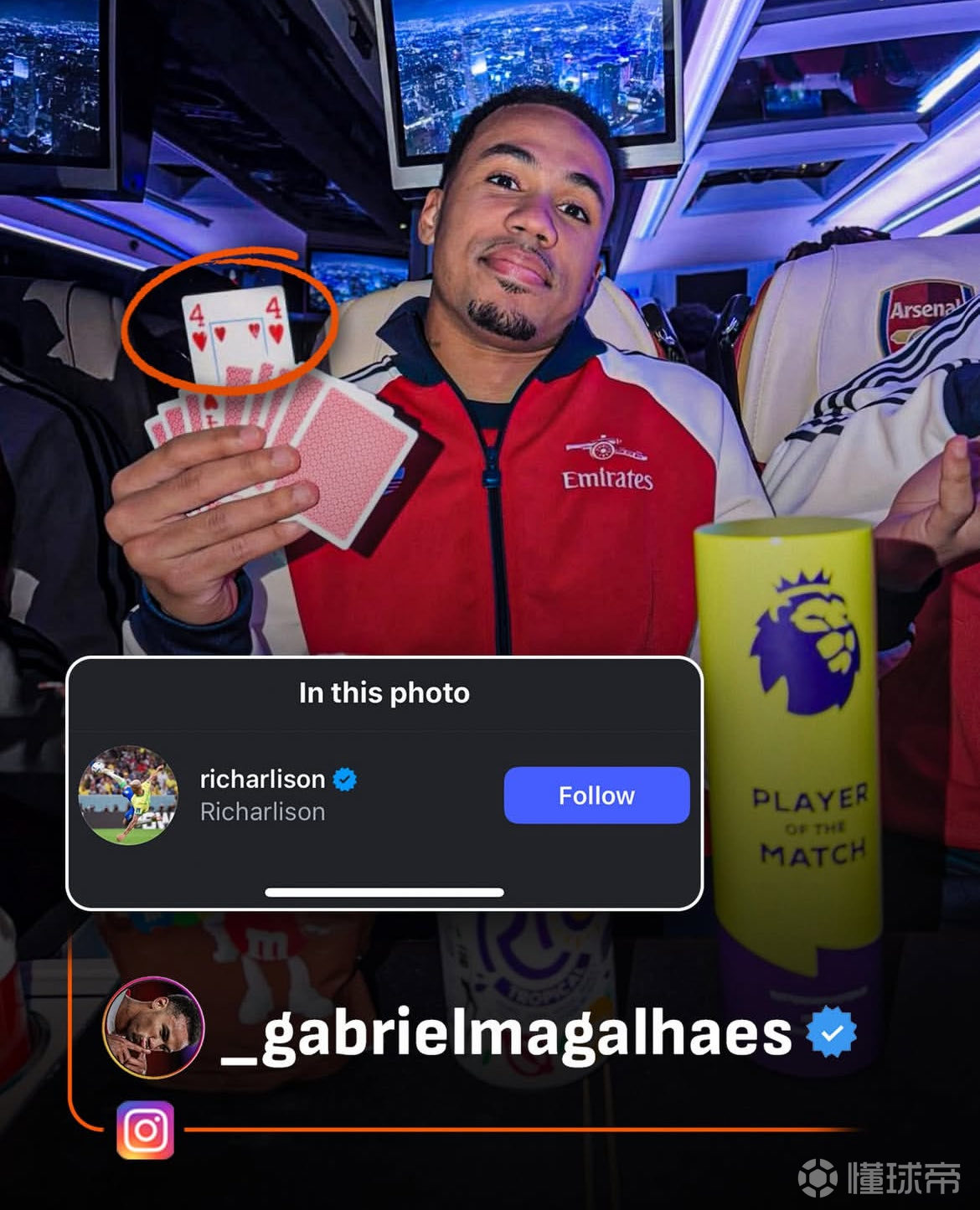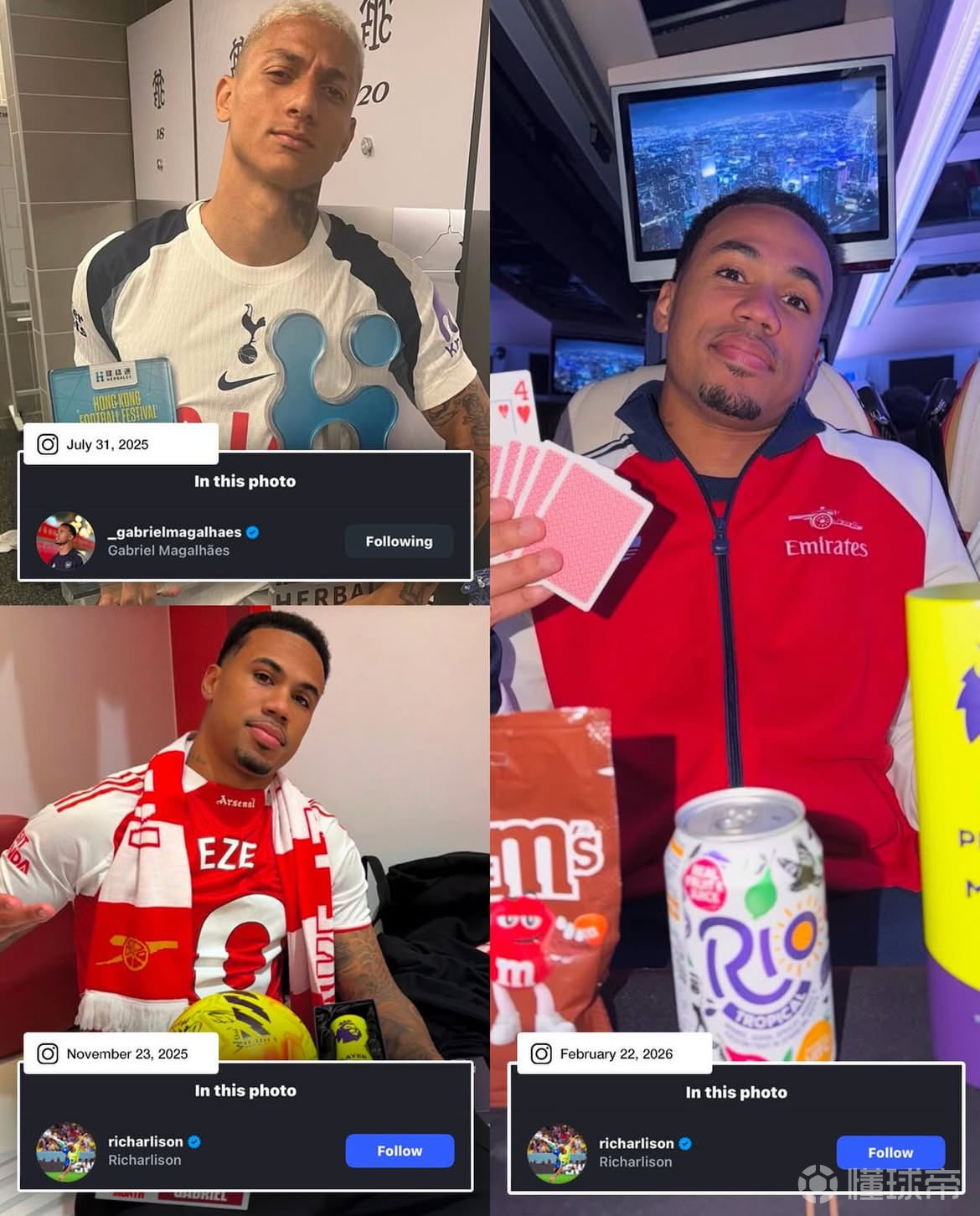 最终,阿森纳4-1联赛双杀热刺。赛后加布里埃尔更新个人社交媒体,他还特意艾特了理查利松!此前,热刺在香港战胜阿森纳后,理查利森晒出自己捧起冠军奖杯和最佳球员奖的照片,并@ 加布里埃尔。加布里埃尔随后晒出自己在北伦敦德比中获得的三座英超最佳球员奖杯,并@ 理查利森。理查利森又晒出了热刺的欧联冠军奖杯回击……如今,看起来两人这互怼没完没了了。
