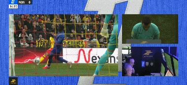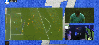 第14分钟,米沙尔禁区手球,裁判观看VAR后判皮球出界在先没有点球
