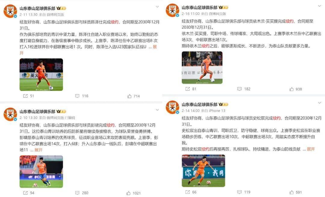 在过去的这个冬天,山东泰山还有一项非常重要的工作,那便是和球队的优秀年轻球员续约,彭啸、陈泽仕、史松宸、依木兰等4名球员都续约到2030年12月31日,即续约五年,这无疑为未来泰山队稳定的发展奠定了坚实的基础。