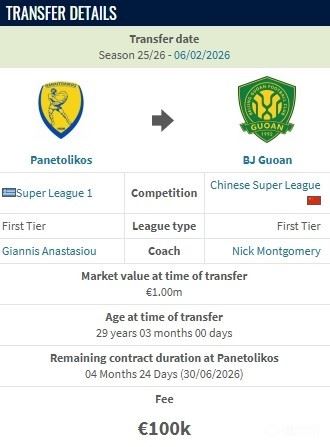 德转显示,法国边锋恩科洛洛从帕纳托利克斯加盟北京国安的转会费为10万欧。