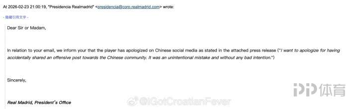 博主“IGotCroatianFever”微博晒图,收到了皇马对于赫伊森辱华事件的回复,称球员已通过中国社媒进行了道歉。皇马回复邮件内容: