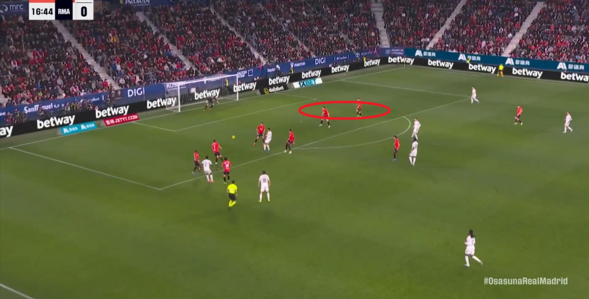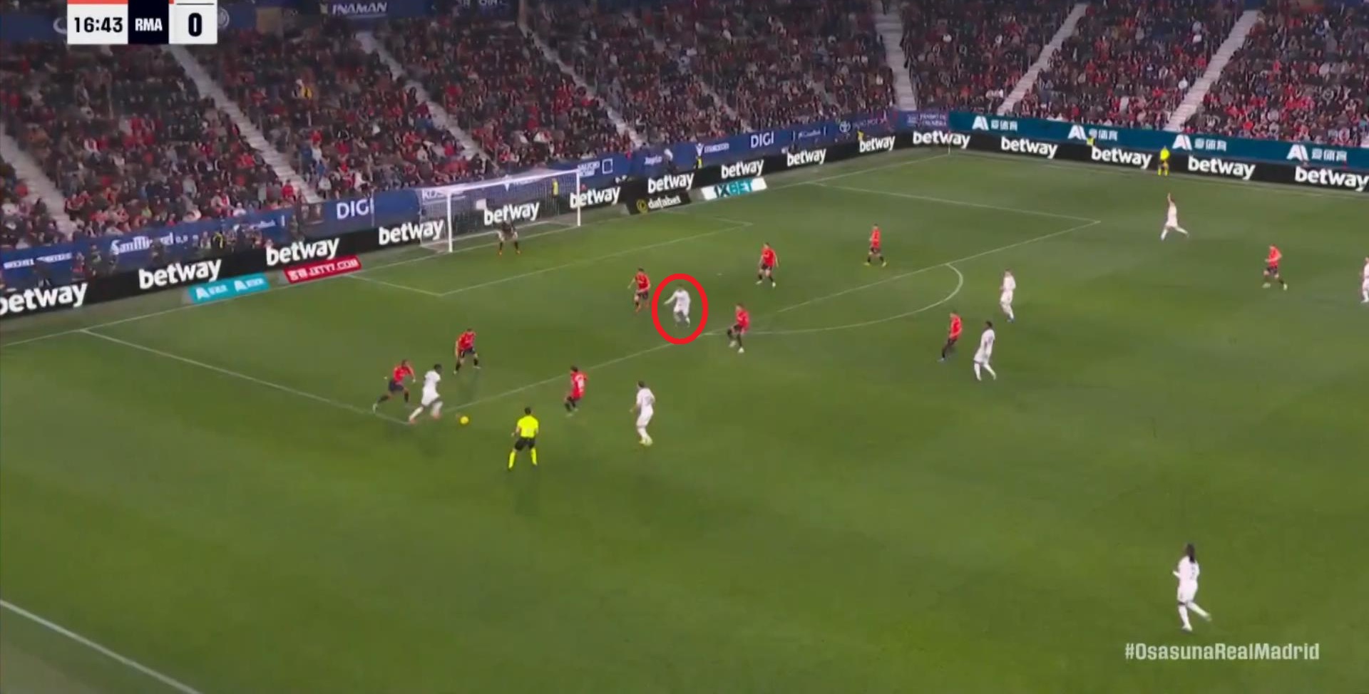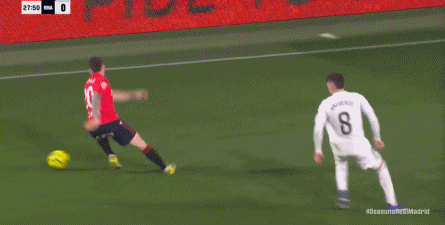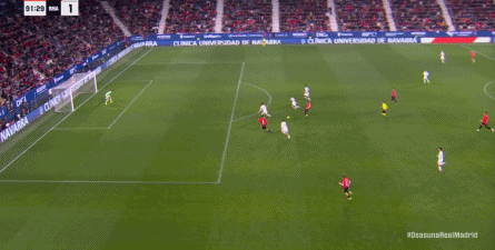 其中一次就是上半场的开分球,在皇马的进攻和逼抢都极其低效的情况下,奥萨苏纳很容易地就能获得起脚空间,就像这次,在边路的处理压力都不大,于是一脚斜长传打到结合部,让皇马付出了点球的代价: